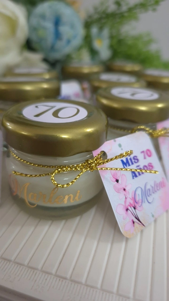 Las tías además nos solicitan Recuerditos o Souvenirs Personalizados para los Baby Showers, entre los más solicitados tenemos: 1- Velitas Pueden ser en diferentes formatos y se adaptan a diferentes celebraciones: a- Velita Aromática en frasco, con aroma, color y tarjetita a elección.